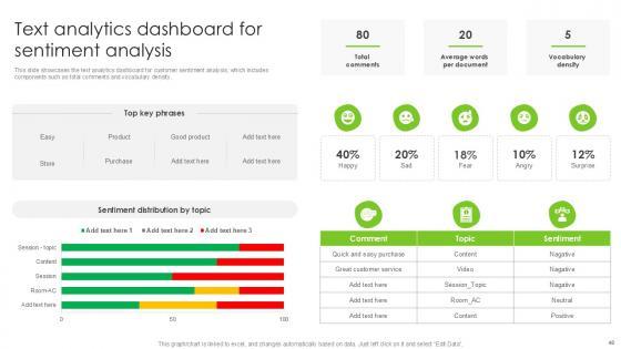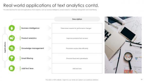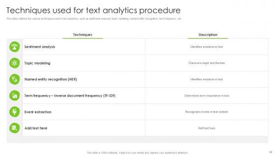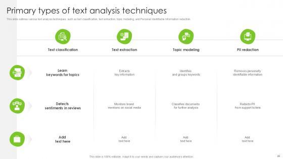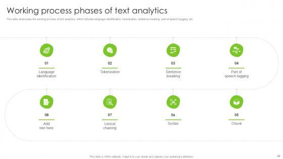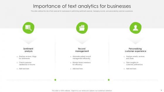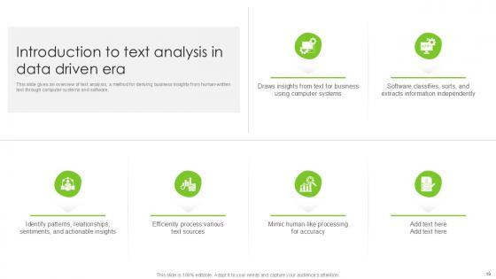 This sixty-slide Text Analytics Powerpoint Presentation Slides is your content ready tool to impress the stakeholders with your business planning and its manner of execution. Showcase your ideas and how you plan to make them real in detail with this PPT Template Bundle. The slides have the conceptual bandwidth to present the crucial aspects of your plan, such as funding, marketing, resource allocation, timeline, roadmap, and more. When you present your plans with this PPT Layout, the stakeholders are sure to come on board because you will be able to present a succinct, thought-out, winning project. Download this Complete Deck now to take control into your hands. The 100 percent customizable offer is just too good to be resisted. Our Text Analytics Powerpoint Presentation Slides are topically designed to provide an attractive backdrop to any subject. Use them to look like a presentation pro.