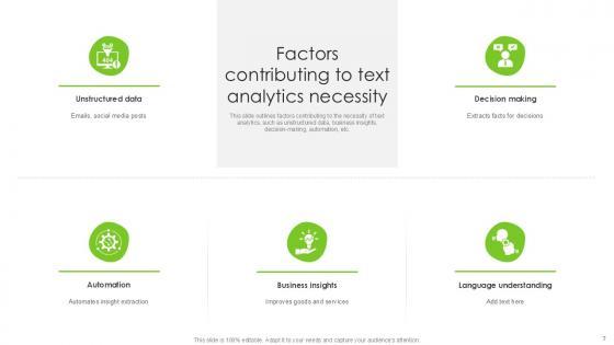 This slide outlines factors contributing to the necessity of text analytics, such as unstructured data, business insights, decision-making, automation, etc. Formulating a presentation can take up a lot of effort and time, so the content and message should always be the primary focus. The visuals of the PowerPoint can enhance the presenters message, so our Factors Contributing To Text Analytics Necessity PPT Sample SS was created to help save time. Instead of worrying about the design, the presenter can concentrate on the message while our designers work on creating the ideal templates for whatever situation is needed. Slidegeeks has experts for everything from amazing designs to valuable content, we have put everything into Factors Contributing To Text Analytics Necessity PPT Sample SS This slide outlines factors contributing to the necessity of text analytics, such as unstructured data, business insights, decision-making, automation, etc.