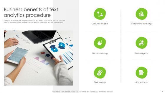 This slide showcases the business benefits of text analytics procedure, such as customer insights, decision-making, cost savings, competitive advantage, and risk management. If you are looking for a format to display your unique thoughts, then the professionally designed Business Benefits Of Text Analytics Procedure PPT Presentation SS is the one for you. You can use it as a Google Slides template or a PowerPoint template. Incorporate impressive visuals, symbols, images, and other charts. Modify or reorganize the text boxes as you desire. Experiment with shade schemes and font pairings. Alter, share or cooperate with other people on your work. Download Business Benefits Of Text Analytics Procedure PPT Presentation SS and find out how to give a successful presentation. Present a perfect display to your team and make your presentation unforgettable. This slide showcases the business benefits of text analytics procedure, such as customer insights, decision-making, cost savings, competitive advantage, and risk management.
