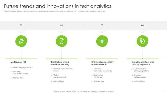 This slide outlines the future advancements and trends in the text analytics field, such as multilingual NLP, contextual brand mentions tracking, etc. Coming up with a presentation necessitates that the majority of the effort goes into the content and the message you intend to convey. The visuals of a PowerPoint presentation can only be effective if it supplements and supports the story that is being told. Keeping this in mind our experts created Future Trends And Innovations In Text Analytics PPT Powerpoint SS to reduce the time that goes into designing the presentation. This way, you can concentrate on the message while our designers take care of providing you with the right template for the situation. This slide outlines the future advancements and trends in the text analytics field, such as multilingual NLP, contextual brand mentions tracking, etc.
