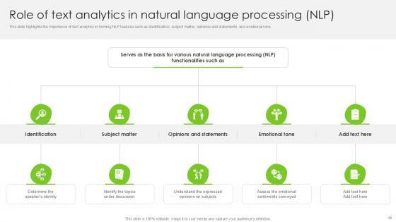 This slide highlights the importance of text analytics in forming NLP features such as identification, subject matter, opinions and statements, and emotional tone. Presenting this PowerPoint presentation, titled Role Of Text Analytics In Natural Language Processing PPT Example SS, with topics curated by our researchers after extensive research. This editable presentation is available for immediate download and provides attractive features when used. Download now and captivate your audience. Presenting this Role Of Text Analytics In Natural Language Processing PPT Example SS. Our researchers have carefully researched and created these slides with all aspects taken into consideration. This is a completely customizable Role Of Text Analytics In Natural Language Processing PPT Example SS that is available for immediate downloading. Download now and make an impact on your audience. Highlight the attractive features available with our PPTs. This slide highlights the importance of text analytics in forming NLP features such as identification, subject matter, opinions and statements, and emotional tone.