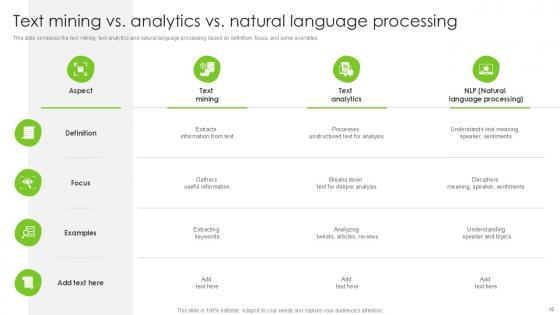 This slide compares the text mining, text analytics and natural language processing based on definition, focus, and some examples. Slidegeeks has constructed Text Mining Vs Analytics Vs Natural Language Processing PPT Presentation SS after conducting extensive research and examination. These presentation templates are constantly being generated and modified based on user preferences and critiques from editors. Here, you will find the most attractive templates for a range of purposes while taking into account ratings and remarks from users regarding the content. This is an excellent jumping-off point to explore our content and will give new users an insight into our top-notch PowerPoint Templates. This slide compares the text mining, text analytics and natural language processing based on definition, focus, and some examples.