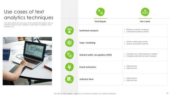 This slide outlines the use cases of text analytics techniques, such as sentiment analysis, topic modeling, named entity recognition, event extraction, etc. This Use Cases Of Text Analytics Techniques PPT Slide SS from Slidegeeks makes it easy to present information on your topic with precision. It provides customization options, so you can make changes to the colors, design, graphics, or any other component to create a unique layout. It is also available for immediate download, so you can begin using it right away. Slidegeeks has done good research to ensure that you have everything you need to make your presentation stand out. Make a name out there for a brilliant performance. This slide outlines the use cases of text analytics techniques, such as sentiment analysis, topic modeling, named entity recognition, event extraction, etc.