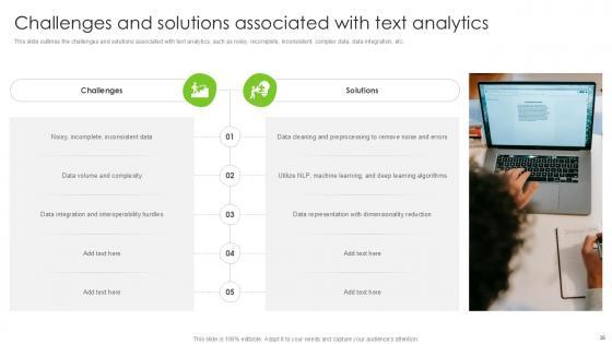 This slide outlines the challenges and solutions associated with text analytics, such as noisy, incomplete, inconsistent, complex data, data integration, etc. Are you in need of a template that can accommodate all of your creative concepts This one is crafted professionally and can be altered to fit any style. Use it with Google Slides or PowerPoint. Include striking photographs, symbols, depictions, and other visuals. Fill, move around, or remove text boxes as desired. Test out color palettes and font mixtures. Edit and save your work, or work with colleagues. Download Challenges And Solutions Associated With Text Analytics PPT Template SS and observe how to make your presentation outstanding. Give an impeccable presentation to your group and make your presentation unforgettable. This slide outlines the challenges and solutions associated with text analytics, such as noisy, incomplete, inconsistent, complex data, data integration, etc.