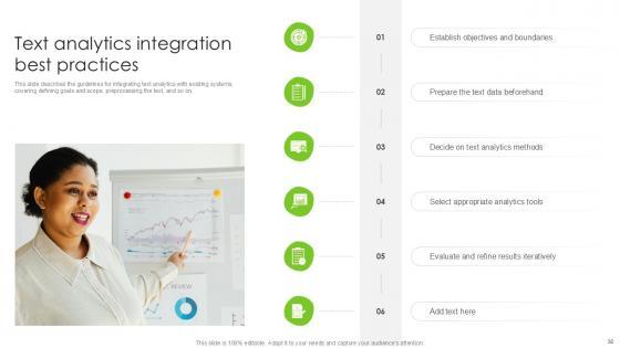 This slide describes the guidelines for integrating text analytics with existing systems, covering defining goals and scope, preprocessing the text, and so on. This Text Analytics Integration Best Practices PPT Slide SS from Slidegeeks makes it easy to present information on your topic with precision. It provides customization options, so you can make changes to the colors, design, graphics, or any other component to create a unique layout. It is also available for immediate download, so you can begin using it right away. Slidegeeks has done good research to ensure that you have everything you need to make your presentation stand out. Make a name out there for a brilliant performance. This slide describes the guidelines for integrating text analytics with existing systems, covering defining goals and scope, preprocessing the text, and so on.