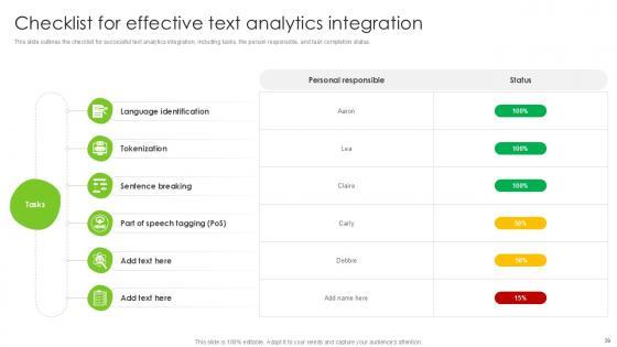 This slide outlines the checklist for successful text analytics integration, including tasks, the person responsible, and task completion status. Crafting an eye-catching presentation has never been more straightforward. Let your presentation shine with this tasteful yet straightforward Checklist For Effective Text Analytics Integration PPT Powerpoint SS template. It offers a minimalistic and classy look that is great for making a statement. The colors have been employed intelligently to add a bit of playfulness while still remaining professional. Construct the ideal Checklist For Effective Text Analytics Integration PPT Powerpoint SS that effortlessly grabs the attention of your audience Begin now and be certain to wow your customers This slide outlines the checklist for successful text analytics integration, including tasks, the person responsible, and task completion status.