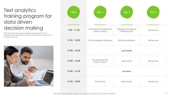 This slide showcases the text analytics training program for IT personnel in an organization, and it includes the time, modules to be covered, and so on. Are you searching for a Text Analytics Training Program For Data Driven Decision Making PPT Template SS that is uncluttered, straightforward, and original Its easy to edit, and you can change the colors to suit your personal or business branding. For a presentation that expresses how much effort you have put in, this template is ideal With all of its features, including tables, diagrams, statistics, and lists, its perfect for a business plan presentation. Make your ideas more appealing with these professional slides. Download Text Analytics Training Program For Data Driven Decision Making PPT Template SS from Slidegeeks today. This slide showcases the text analytics training program for IT personnel in an organization, and it includes the time, modules to be covered, and so on.