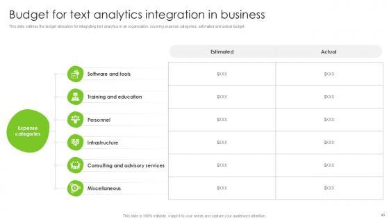 This slide outlines the budget allocation for integrating text analytics in an organization, covering expense categories, estimated and actual budget. If your project calls for a presentation, then Slidegeeks is your go-to partner because we have professionally designed, easy-to-edit templates that are perfect for any presentation. After downloading, you can easily edit Budget For Text Analytics Integration In Business PPT Powerpoint SS and make the changes accordingly. You can rearrange slides or fill them with different images. Check out all the handy templates This slide outlines the budget allocation for integrating text analytics in an organization, covering expense categories, estimated and actual budget.