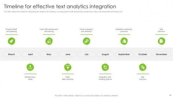 This slide outlines the timeline for integrating text analytics into business, covering project kickoff and planning, infrastructure setup, skill assessment and training, etc. Presenting this PowerPoint presentation, titled Timeline For Effective Text Analytics Integration PPT Presentation SS, with topics curated by our researchers after extensive research. This editable presentation is available for immediate download and provides attractive features when used. Download now and captivate your audience. Presenting this Timeline For Effective Text Analytics Integration PPT Presentation SS. Our researchers have carefully researched and created these slides with all aspects taken into consideration. This is a completely customizable Timeline For Effective Text Analytics Integration PPT Presentation SS that is available for immediate downloading. Download now and make an impact on your audience. Highlight the attractive features available with our PPTs. This slide outlines the timeline for integrating text analytics into business, covering project kickoff and planning, infrastructure setup, skill assessment and training, etc.
