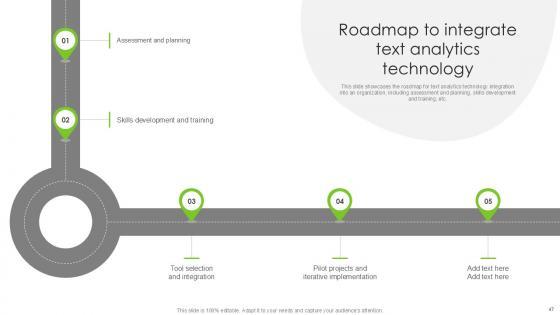 This slide showcases the roadmap for text analytics technology integration into an organization, including assessment and planning, skills development and training, etc. Slidegeeks has constructed Roadmap To Integrate Text Analytics Technology PPT Example SS after conducting extensive research and examination. These presentation templates are constantly being generated and modified based on user preferences and critiques from editors. Here, you will find the most attractive templates for a range of purposes while taking into account ratings and remarks from users regarding the content. This is an excellent jumping-off point to explore our content and will give new users an insight into our top-notch PowerPoint Templates. This slide showcases the roadmap for text analytics technology integration into an organization, including assessment and planning, skills development and training, etc.