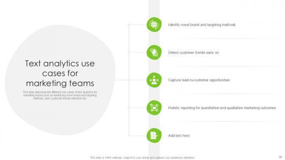 This slide describes the different use cases of text analytics for marketing teams such as identifying novel brand and targeting methods, early customer trends detection etc. Retrieve professionally designed Text Analytics Use Cases For Marketing Teams PPT Sample SS to effectively convey your message and captivate your listeners. Save time by selecting pre-made slideshows that are appropriate for various topics, from business to educational purposes. These themes come in many different styles, from creative to corporate, and all of them are easily adjustable and can be edited quickly. Access them as PowerPoint templates or as Google Slides themes. You do not have to go on a hunt for the perfect presentation because Slidegeeks got you covered from everywhere. This slide describes the different use cases of text analytics for marketing teams such as identifying novel brand and targeting methods, early customer trends detection etc.