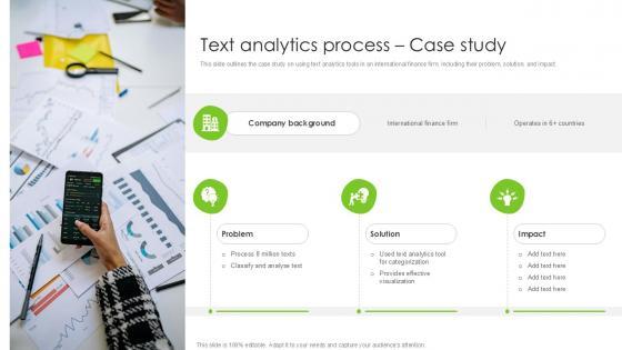 This slide outlines the case study on using text analytics tools in an international finance firm, including their problem, solution, and impact. Take your projects to the next level with our ultimate collection of Text Analytics Process Case Study PPT Template SS. Slidegeeks has designed a range of layouts that are perfect for representing task or activity duration, keeping track of all your deadlines at a glance. Tailor these designs to your exact needs and give them a truly corporate look with your own brand colors they will make your projects stand out from the rest This slide outlines the case study on using text analytics tools in an international finance firm, including their problem, solution, and impact.