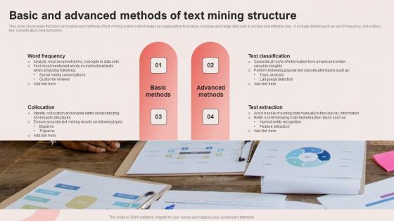 This slide showcases the basic and advanced methods of text mining system which helps an organization to analyze complex and large data sets in simple and effective way. It include details such as word frequency, collocation, text classification, text extraction. Showcasing this set of slides titled Basic And Advanced Methods Of Text Mining Structure Structure Pdf. The topics addressed in these templates are Word Frequency, Collocation, Text Classification. All the content presented in this PPT design is completely editable. Download it and make adjustments in color, background, font etc. as per your unique business setting. This slide showcases the basic and advanced methods of text mining system which helps an organization to analyze complex and large data sets in simple and effective way. It include details such as word frequency, collocation, text classification, text extraction.