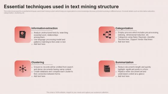 This slide showcases the essential techniques used in text mining system which helps an organization to solve knowledge discovery pr5oblems arising in different areas. It include details such as information extraction, categorization, clustering, etc. Pitch your topic with ease and precision using this Essential Techniques Used In Text Mining Structure Inspiration Pdf. This layout presents information on Information Extraction, Categorization, Summarization. It is also available for immediate download and adjustment. So, changes can be made in the color, design, graphics or any other component to create a unique layout. This slide showcases the essential techniques used in text mining system which helps an organization to solve knowledge discovery pr5oblems arising in different areas. It include details such as information extraction, categorization, clustering, etc.