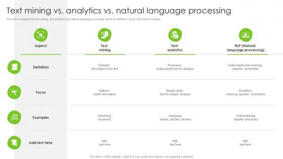 This slide compares the text mining, text analytics and natural language processing based on definition, focus, and some examples. Slidegeeks has constructed Text Mining Vs Analytics Vs Natural Language Processing PPT Presentation SS after conducting extensive research and examination. These presentation templates are constantly being generated and modified based on user preferences and critiques from editors. Here, you will find the most attractive templates for a range of purposes while taking into account ratings and remarks from users regarding the content. This is an excellent jumping-off point to explore our content and will give new users an insight into our top-notch PowerPoint Templates. This slide compares the text mining, text analytics and natural language processing based on definition, focus, and some examples.