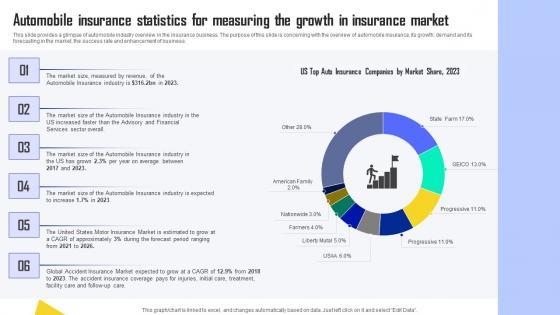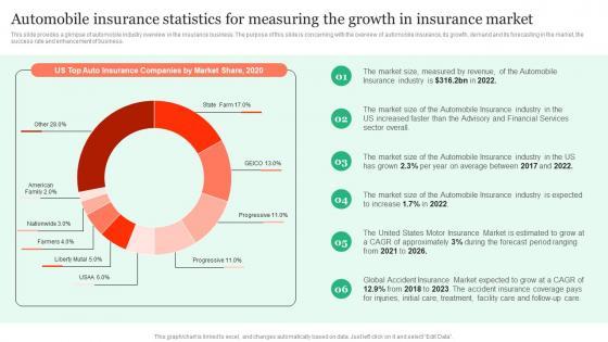 This slide provides a glimpse of automobile industry overview in the insurance business. The purpose of this slide is concerning with the overview of automobile insurance, its growth, demand and its forecasting in the market, the success rate and enhancement of business. Boost your pitch with our creative Automobile Insurance Statistics For Measuring The Growth Automobile Insurance Agency Guidelines Pdf. Deliver an awe-inspiring pitch that will mesmerize everyone. Using these presentation templates you will surely catch everyones attention. You can browse the ppts collection on our website. We have researchers who are experts at creating the right content for the templates. So you do not have to invest time in any additional work. Just grab the template now and use them. This slide provides a glimpse of automobile industry overview in the insurance business. The purpose of this slide is concerning with the overview of automobile insurance, its growth, demand and its forecasting in the market, the success rate and enhancement of business.