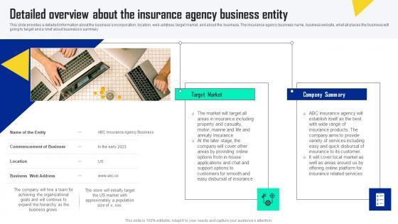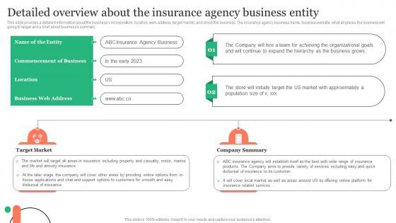 This slide provides a detailed information about the businesss incorporation, location, web-address, target market, and about the business. The insurance agency business name, business website, what all places the business will going to target and a brief about businesss summary. Present like a pro with Detailed Overview About The Insurance Agency Business Entity Assurant Insurance Agency Demonstration Pdf Create beautiful presentations together with your team, using our easy-to-use presentation slides. Share your ideas in real-time and make changes on the fly by downloading our templates. So whether you are in the office, on the go, or in a remote location, you can stay in sync with your team and present your ideas with confidence. With Slidegeeks presentation got a whole lot easier. Grab these presentations today. This slide provides a detailed information about the businesss incorporation, location, web-address, target market, and about the business. The insurance agency business name, business website, what all places the business will going to target and a brief about businesss summary.