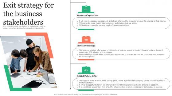 This slide represents exit strategy for stakeholders such as venture capitalists, private offerings and initial public offer. Do you have an important presentation coming up Are you looking for something that will make your presentation stand out from the rest Look no further than Exit Strategy For The Business Stakeholders Insurance Business Plan Guidelines Pdf. With our professional designs, you can trust that your presentation will pop and make delivering it a smooth process. And with Slidegeeks, you can trust that your presentation will be unique and memorable. So why wait Grab Exit Strategy For The Business Stakeholders Insurance Business Plan Guidelines Pdf today and make your presentation stand out from the rest This slide represents exit strategy for stakeholders such as venture capitalists, private offerings and initial public offer.