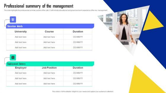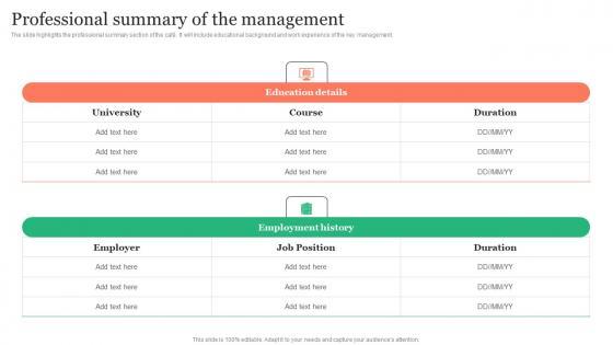 The slide highlights the professional summary section of the cafe. It will include educational background and work experience of the key management.Are you searching for a Professional Summary Of The Management Insurance Broker Business Plan Microsoft Pdf that is uncluttered, straightforward, and original Its easy to edit, and you can change the colors to suit your personal or business branding. For a presentation that expresses how much effort you have put in, this template is ideal. With all of its features, including tables, diagrams, statistics, and lists, its perfect for a business plan presentation. Make your ideas more appealing with these professional slides. Download Professional Summary Of The Management Insurance Broker Business Plan Microsoft Pdf from Slidegeeks today. The slide highlights the professional summary section of the cafe. It will include educational background and work experience of the key management.
