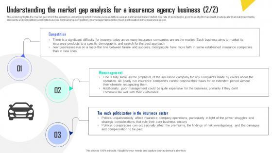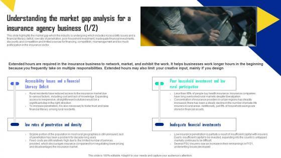 This slide highlights the market gap which the industry is undergoing which includes Accessibility issues and a financial literacy deficit, low rate of penetration, poor household investment, inadequate financial investments, discounts and competition and limited sources for financing, competition, mismanagement and too much politicization in the insurance sector. Take your projects to the next level with our ultimate collection of Understanding The Market Gap Analysis For A Insurance Automobile Insurance Agency Designs Pdf. Slidegeeks has designed a range of layouts that are perfect for representing task or activity duration, keeping track of all your deadlines at a glance. Tailor these designs to your exact needs and give them a truly corporate look with your own brand colors they well make your projects stand out from the rest. This slide highlights the market gap which the industry is undergoing which includes Accessibility issues and a financial literacy deficit, low rate of penetration, poor household investment, inadequate financial investments, discounts and competition and limited sources for financing, competition, mismanagement and too much politicization in the insurance sector.