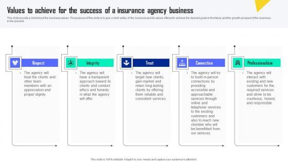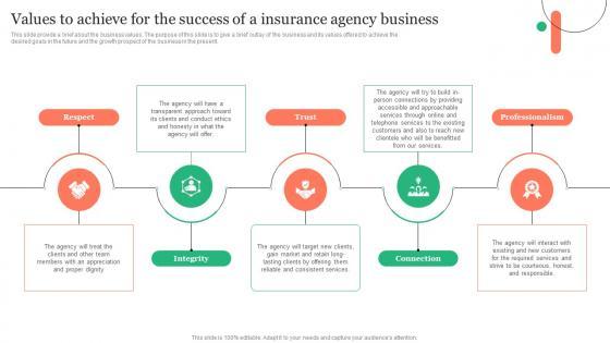 This slide provide a brief about the business values. The purpose of this slide is to give a brief outlay of the business and its values offered to achieve the desired goals in the future and the growth prospect of the business in the present.Boost your pitch with our creative Values To Achieve For The Success Of A Insurance Broker Business Plan Background Pdf Deliver an awe-inspiring pitch that will mesmerize everyone. Using these presentation templates you will surely catch everyones attention. You can browse the ppts collection on our website. We have researchers who are experts at creating the right content for the templates. So you do not have to invest time in any additional work. Just grab the template now and use them. This slide provide a brief about the business values. The purpose of this slide is to give a brief outlay of the business and its values offered to achieve the desired goals in the future and the growth prospect of the business in the present.