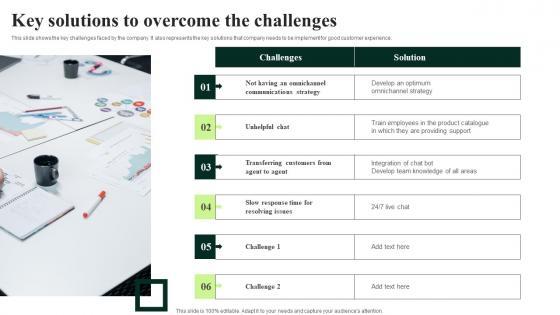 This slide shows the key challenges faced by the company. It also represents the key solutions that company needs to be implement for good customer experience. The best PPT templates are a great way to save time, energy, and resources. Slidegeeks have 100 percent editable powerpoint slides making them incredibly versatile. With these quality presentation templates, you can create a captivating and memorable presentation by combining visually appealing slides and effectively communicating your message. Download Enhancing CX Strategy Key Solutions To Overcome The Challenges Ideas PDF from Slidegeeks and deliver a wonderful presentation.