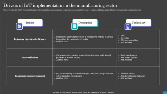This slide highlights the IoT implementation drivers for manufacturing and production sector which showcases it will improve operational efficiency, asset utilization and business process development. From laying roadmaps to briefing everything in detail, our templates are perfect for you. You can set the stage with your presentation slides. All you have to do is download these easy-to-edit and customizable templates. Global Internet Of Things In Manufacturing Drivers Of Iot Implementation In The Manufacturing Pictures PDF will help you deliver an outstanding performance that everyone would remember and praise you for. Do download this presentation today.