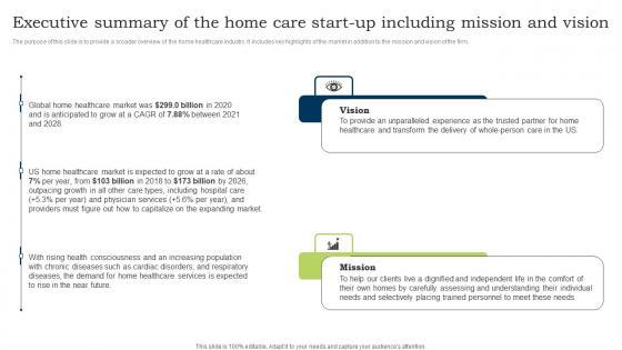 The purpose of this slide is to provide a broader overview of the home healthcare industry. It includes key highlights of the market in addition to the mission and vision of the firm. If you are looking for a format to display your unique thoughts, then the professionally designed Go To Market Strategy Executive Summary Of The Home Care Start Up Including Mission Graphics Pdf is the one for you. You can use it as a Google Slides template or a PowerPoint template. Incorporate impressive visuals, symbols, images, and other charts. Modify or reorganize the text boxes as you desire. Experiment with shade schemes and font pairings. Alter, share or cooperate with other people on your work. Download Go To Market Strategy Executive Summary Of The Home Care Start Up Including Mission Graphics Pdf and find out how to give a successful presentation. Present a perfect display to your team and make your presentation unforgettable. The purpose of this slide is to provide a broader overview of the home healthcare industry. It includes key highlights of the market in addition to the mission and vision of the firm.