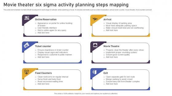 This slide demonstrate moment of truth touchpoint in each stage of activate while watching a movie. It includes elements such as online reservation, arrival, ticket counter, movie theatre, food counters and exit. Pitch your topic with ease and precision using this Movie Theater Six Sigma Activity Planning Steps Mapping Portrait Pdf. This layout presents information on Online Reservation, Ticket Counter, Movie Theatre. It is also available for immediate download and adjustment. So, changes can be made in the color, design, graphics or any other component to create a unique layout. This slide demonstrate moment of truth touchpoint in each stage of activate while watching a movie. It includes elements such as online reservation, arrival, ticket counter, movie theatre, food counters and exit.