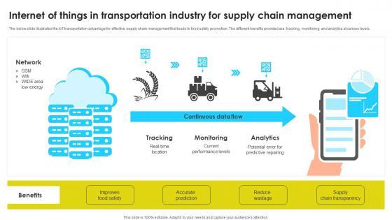 The below slide illustrates the IoT transportation advantage for effective supply chain management that leads to food safety promotion. The different benefits provided are tracking, monitoring, and analytics at various levels. Showcasing this set of slides titled Internet Of Things In Transportation Industry For Supply Chain Management Icons Pdf The topics addressed in these templates are Continuous Data Flow, Monitoring, Analytics, Tracking All the content presented in this PPT design is completely editable. Download it and make adjustments in color, background, font etc. as per your unique business setting. The below slide illustrates the IoT transportation advantage for effective supply chain management that leads to food safety promotion. The different benefits provided are tracking, monitoring, and analytics at various levels.