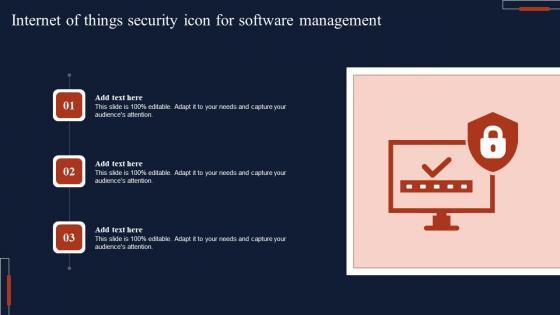 Showcasing this set of slides titled Internet Of Things Security Icon For Software Management Template Pdf The topics addressed in these templates are Internet Of Things Security, Icon For Software, Management All the content presented in this PPT design is completely editable. Download it and make adjustments in color, background, font etc. as per your unique business setting. Our Internet Of Things Security Icon For Software Management Template Pdf are topically designed to provide an attractive backdrop to any subject. Use them to look like a presentation pro.