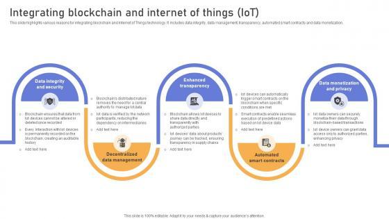 This slide highlights various reasons for integrating blockchain and Internet of Things technology. It includes data integrity, data management, transparency, automated smart contracts and data monetization. The Visionary Guide To Blockchain Integrating Blockchain And Internet Of Things IoT BCT SS V is a compilation of the most recent design trends as a series of slides. It is suitable for any subject or industry presentation, containing attractive visuals and photo spots for businesses to clearly express their messages. This template contains a variety of slides for the user to input data, such as structures to contrast two elements, bullet points, and slides for written information. Slidegeeks is prepared to create an impression. This slide highlights various reasons for integrating blockchain and Internet of Things technology. It includes data integrity, data management, transparency, automated smart contracts and data monetization.