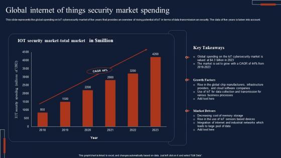 This slide represents the global spending on IoT cybersecurity market of five years that provides an overview of rising potential of IoT in terms of data transmission an security. The data of five years is taken into account. Pitch your topic with ease and precision using this Global Internet Of Things Security Market Spending Download Pdf This layout presents information on IOT Security, Market Total, Key Takeaways It is also available for immediate download and adjustment. So, changes can be made in the color, design, graphics or any other component to create a unique layout. This slide represents the global spending on IoT cybersecurity market of five years that provides an overview of rising potential of IoT in terms of data transmission an security. The data of five years is taken into account.
