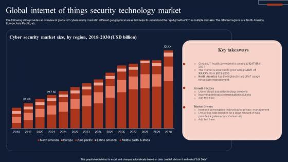 The following slide provides an overview of global IoT cybersecurity market in different geographical areas that helps to understand the rapid growth of IoT in multiple domains. The different regions are North America, Europe, Asia Pacific, etc. Showcasing this set of slides titled Global Internet Of Things Security Technology Market Infographics Pdf The topics addressed in these templates are Cyber Security, Market Size, Technology Market All the content presented in this PPT design is completely editable. Download it and make adjustments in color, background, font etc. as per your unique business setting. The following slide provides an overview of global IoT cybersecurity market in different geographical areas that helps to understand the rapid growth of IoT in multiple domains. The different regions are North America, Europe, Asia Pacific, etc.
