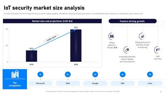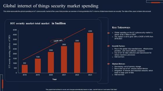 This slide showcases a graphical representation of IoT securitys global market size. It includes various growth drivers such as the growing number of IoT devices in market and rise in malware attacks to infect enterprise IoT devices. This modern and well-arranged Building Trust With IoT Security Internet Of Things Security Global Market Size IoT SS V provides lots of creative possibilities. It is very simple to customize and edit with the Powerpoint Software. Just drag and drop your pictures into the shapes. All facets of this template can be edited with Powerpoint, no extra software is necessary. Add your own material, put your images in the places assigned for them, adjust the colors, and then you can show your slides to the world, with an animated slide included. This slide showcases a graphical representation of IoT securitys global market size. It includes various growth drivers such as the growing number of IoT devices in market and rise in malware attacks to infect enterprise IoT devices.