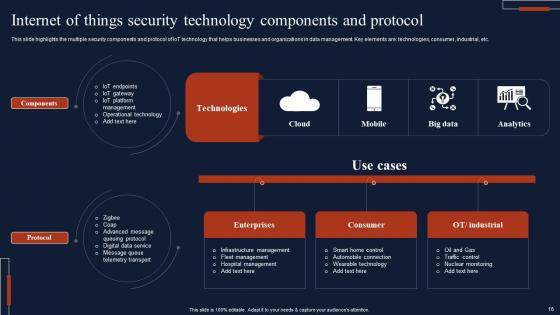 This slide highlights the multiple security components and protocol of IoT technology that helps businesses and organizations in data management. Key elements are technologies, consumer, industrial, etc. Pitch your topic with ease and precision using this Internet Of Things Security Technology Components And Protocol Rules Pdf This layout presents information on Components, Protocol, Technologies, Consumer It is also available for immediate download and adjustment. So, changes can be made in the color, design, graphics or any other component to create a unique layout. This slide highlights the multiple security components and protocol of IoT technology that helps businesses and organizations in data management. Key elements are technologies, consumer, industrial, etc.