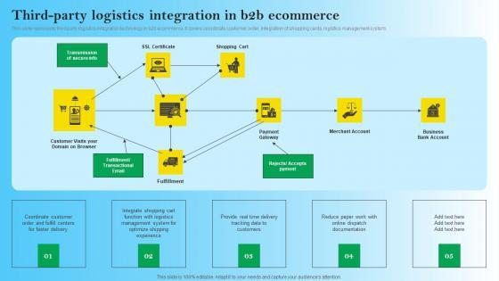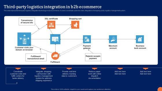 This slide represents third party logistics integration technology in b2b ecommerce. It covers coordinate customer order, integration of shopping cards, logistics management system.Are you in need of a template that can accommodate all of your creative concepts This one is crafted professionally and can be altered to fit any style. Use it with Google Slides or PowerPoint. Include striking photographs, symbols, depictions, and other visuals. Fill, move around, or remove text boxes as desired. Test out color palettes and font mixtures. Edit and save your work, or work with colleagues. Download Third Party Logistics Integration In B2b Ecommerce Comprehensive Guide For Developing Infographics PDF and observe how to make your presentation outstanding. Give an impeccable presentation to your group and make your presentation unforgettable.