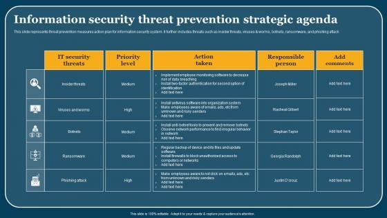 This slide represents threat prevention measures action plan for information security system. It further includes threats such as insider threats, viruses and worms, botnets, ransomware, and phishing attack. Pitch your topic with ease and precision using this Information Security Threat Prevention Strategic Agenda Introduction Pdf. This layout presents information on Security Threats, Priority Level, Action Taken. It is also available for immediate download and adjustment. So, changes can be made in the color, design, graphics or any other component to create a unique layout. This slide represents threat prevention measures action plan for information security system. It further includes threats such as insider threats, viruses and worms, botnets, ransomware, and phishing attack.
