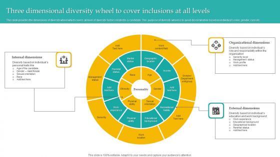 This slide provides the dimensions of diversity wheel which covers all level of diversity factors related to a candidate. The purpose of diversity wheel is to avoid discrimination based on individuals color, gender, race etc. Slidegeeks has constructed Three Dimensional Diversity Wheel To Cover Inclusions At All Levels Icons PDF after conducting extensive research and examination. These presentation templates are constantly being generated and modified based on user preferences and critiques from editors. Here, you will find the most attractive templates for a range of purposes while taking into account ratings and remarks from users regarding the content. This is an excellent jumping-off point to explore our content and will give new users an insight into our top-notch PowerPoint Templates.