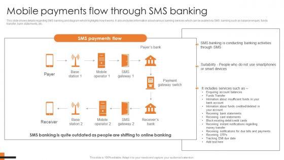 This slide shows details regarding SMS banking and diagram which highlights how it works. It also includes information about various banking services which can be availed via SMS banking such as balance enquiry, funds transfer, bank statements, etc. Find highly impressive Mobile Payments Flow Through SMS Banking Ppt Portfolio Information PDF on Slidegeeks to deliver a meaningful presentation. You can save an ample amount of time using these presentation templates. No need to worry to prepare everything from scratch because Slidegeeks experts have already done a huge research and work for you. You need to download Mobile Payments Flow Through SMS Banking Ppt Portfolio Information PDF for your upcoming presentation. All the presentation templates are 100 percent editable and you can change the color and personalize the content accordingly. Download now.
