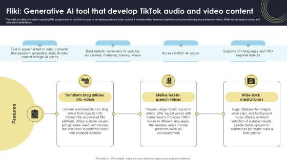 This slide provides information regarding Fliki as generative AI tool that focuses on developing audio and video content. It includes salient features of platform such as transforming blog articles into videos, lifelike text-to-speech voices, and wide stock media library. Coming up with a presentation necessitates that the majority of the effort goes into the content and the message you intend to convey. The visuals of a PowerPoint presentation can only be effective if it supplements and supports the story that is being told. Keeping this in mind our experts created Fliki Generative AI Tool That Develop Tiktok Audio How Generative AI Tools Work AI SS V to reduce the time that goes into designing the presentation. This way, you can concentrate on the message while our designers take care of providing you with the right template for the situation. This slide provides information regarding Fliki as generative AI tool that focuses on developing audio and video content. It includes salient features of platform such as transforming blog articles into videos, lifelike text-to-speech voices, and wide stock media library.