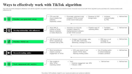 This slide shows the strategies to effectively work with the algorithm of a platform used by marketers to promote their brands. It includes ways to work with TikTok algorithm such as prioritize UGC, develop relations with influencers etc. The Ways To Effectively Work With Tiktok Algorithm Guidelines PDF is a compilation of the most recent design trends as a series of slides. It is suitable for any subject or industry presentation, containing attractive visuals and photo spots for businesses to clearly express their messages. This template contains a variety of slides for the user to input data, such as structures to contrast two elements, bullet points, and slides for written information. Slidegeeks is prepared to create an impression.