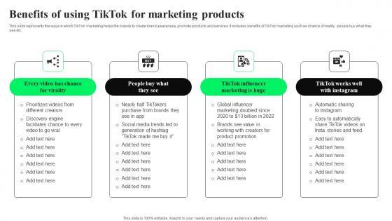 This slide represents the ways in which TikTok marketing helps the brands to create brand awareness, promote products and services. It includes benefits of TikTok marketing such as chance of virality, people buy what they see etc. From laying roadmaps to briefing everything in detail, our templates are perfect for you. You can set the stage with your presentation slides. All you have to do is download these easy to edit and customizable templates. Benefits Of Using TikTok For Marketing TikTok Advertising Strategies To Provide Effective Template Pdf will help you deliver an outstanding performance that everyone would remember and praise you for. Do download this presentation today. This slide represents the ways in which TikTok marketing helps the brands to create brand awareness, promote products and services. It includes benefits of TikTok marketing such as chance of virality, people buy what they see etc.