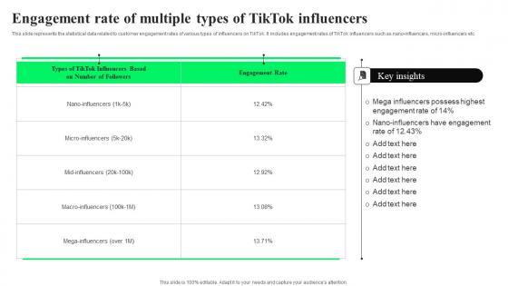This slide represents the categories on which content is mainly created and catered by influencers and audience on TikTok. It includes details related to distribution of various categories of influencer marketing on TikTok. This slide represents the statistical data related to customer engagement rates of various types of influencers on TikTok. It includes engagement rates of TikTok influencers such as nano influencers, micro influencers etc. Do you have an important presentation coming up Are you looking for something that will make your presentation stand out from the rest Look no further than Distribution Of Instagram Influencers TikTok Advertising Strategies To Provide Effective Guidelines Pdf. With our professional designs, you can trust that your presentation will pop and make delivering it a smooth process. And with Slidegeeks, you can trust that your presentation will be unique and memorable. So why wait Grab Distribution Of Instagram Influencers TikTok Advertising Strategies To Provide Effective Guidelines Pdf today and make your presentation stand out from the rest This slide represents the categories on which content is mainly created and catered by influencers and audience on TikTok. It includes details related to distribution of various categories of influencer marketing on TikTok.