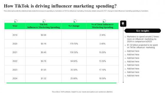 This slide represents the statistical data related to increase in spending by marketers on TikTok influencer marketing. It includes details relayed to YOY change in total influencer marketing spending by marketers. If you are looking for a format to display your unique thoughts, then the professionally designed How TikTok Is Driving Influencer TikTok Advertising Strategies To Provide Effective Sample Pdf is the one for you. You can use it as a Google Slides template or a PowerPoint template. Incorporate impressive visuals, symbols, images, and other charts. Modify or reorganize the text boxes as you desire. Experiment with shade schemes and font pairings. Alter, share or cooperate with other people on your work. Download How TikTok Is Driving Influencer TikTok Advertising Strategies To Provide Effective Sample Pdf and find out how to give a successful presentation. Present a perfect display to your team and make your presentation unforgettable. This slide represents the statistical data related to increase in spending by marketers on TikTok influencer marketing. It includes details relayed to YOY change in total influencer marketing spending by marketers.