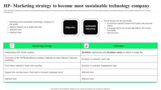 This slide represents the use case for marketing techniques used by HP brand to become most sustainable company in the world. It includes details related to marketing strategies such as partnership with TikTok creators, hashtags etc. Are you in need of a template that can accommodate all of your creative concepts This one is crafted professionally and can be altered to fit any style. Use it with Google Slides or PowerPoint. Include striking photographs, symbols, depictions, and other visuals. Fill, move around, or remove text boxes as desired. Test out color palettes and font mixtures. Edit and save your work, or work with colleagues. Download HP Marketing Strategy To Become Most TikTok Advertising Strategies To Provide Effective Structure Pdf and observe how to make your presentation outstanding. Give an impeccable presentation to your group and make your presentation unforgettable. This slide represents the use case for marketing techniques used by HP brand to become most sustainable company in the world. It includes details related to marketing strategies such as partnership with TikTok creators, hashtags etc.