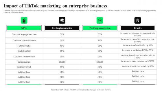 This slide represents the comparison between current and past scenario of business operations to analyze the impact of TikTok marketing on business operations. It includes analysis of KPIs such as customer engagement rate, customer conversion rate etc. Crafting an eye catching presentation has never been more straightforward. Let your presentation shine with this tasteful yet straightforward Impact Of TikTok Marketing On Enterprise TikTok Advertising Strategies To Provide Effective Ideas Pdf template. It offers a minimalistic and classy look that is great for making a statement. The colors have been employed intelligently to add a bit of playfulness while still remaining professional. Construct the ideal Impact Of TikTok Marketing On Enterprise TikTok Advertising Strategies To Provide Effective Ideas Pdf that effortlessly grabs the attention of your audience Begin now and be certain to wow your customers This slide represents the comparison between current and past scenario of business operations to analyze the impact of TikTok marketing on business operations. It includes analysis of KPIs such as customer engagement rate, customer conversion rate etc.