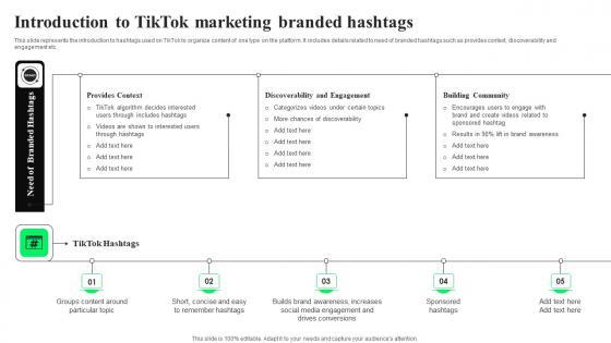 This slide represents the introduction to hashtags used on TikTok to organize content of one type on the platform. It includes details related to need of branded hashtags such as provides context, discoverability and engagement etc. Formulating a presentation can take up a lot of effort and time, so the content and message should always be the primary focus. The visuals of the PowerPoint can enhance the presenters message, so our Introduction To TikTok Marketing Branded TikTok Advertising Strategies To Provide Effective Designs Pdf was created to help save time. Instead of worrying about the design, the presenter can concentrate on the message while our designers work on creating the ideal templates for whatever situation is needed. Slidegeeks has experts for everything from amazing designs to valuable content, we have put everything into Introduction To TikTok Marketing Branded TikTok Advertising Strategies To Provide Effective Designs Pdf This slide represents the introduction to hashtags used on TikTok to organize content of one type on the platform. It includes details related to need of branded hashtags such as provides context, discoverability and engagement etc.