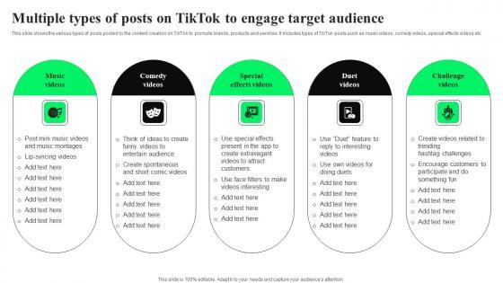 This slide shows the various types of posts posted by the content creators on TikTok to promote brands, products and services. It includes types of TikTok posts such as music videos, comedy videos, special effects videos etc. Explore a selection of the finest Multiple Types Of Posts On TikTok To Engage TikTok Advertising Strategies To Provide Effective Inspiration Pdf here. With a plethora of professionally designed and pre made slide templates, you can quickly and easily find the right one for your upcoming presentation. You can use our Multiple Types Of Posts On TikTok To Engage TikTok Advertising Strategies To Provide Effective Inspiration Pdf to effectively convey your message to a wider audience. Slidegeeks has done a lot of research before preparing these presentation templates. The content can be personalized and the slides are highly editable. Grab templates today from Slidegeeks. This slide shows the various types of posts posted by the content creators on TikTok to promote brands, products and services. It includes types of TikTok posts such as music videos, comedy videos, special effects videos etc.