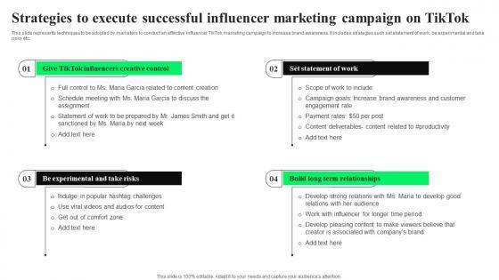 This slide represents techniques to be adopted by marketers to conduct an effective influencer TikTok marketing campaign to increase brand awareness. It includes strategies such set statement of work, be experimental and take risks etc. Retrieve professionally designed Strategies To Execute Successful Influencer TikTok Advertising Strategies To Provide Effective Structure Pdf to effectively convey your message and captivate your listeners. Save time by selecting pre made slideshows that are appropriate for various topics, from business to educational purposes. These themes come in many different styles, from creative to corporate, and all of them are easily adjustable and can be edited quickly. Access them as PowerPoint templates or as Google Slides themes. You do not have to go on a hunt for the perfect presentation because Slidegeeks got you covered from everywhere. This slide represents techniques to be adopted by marketers to conduct an effective influencer TikTok marketing campaign to increase brand awareness. It includes strategies such set statement of work, be experimental and take risks etc.